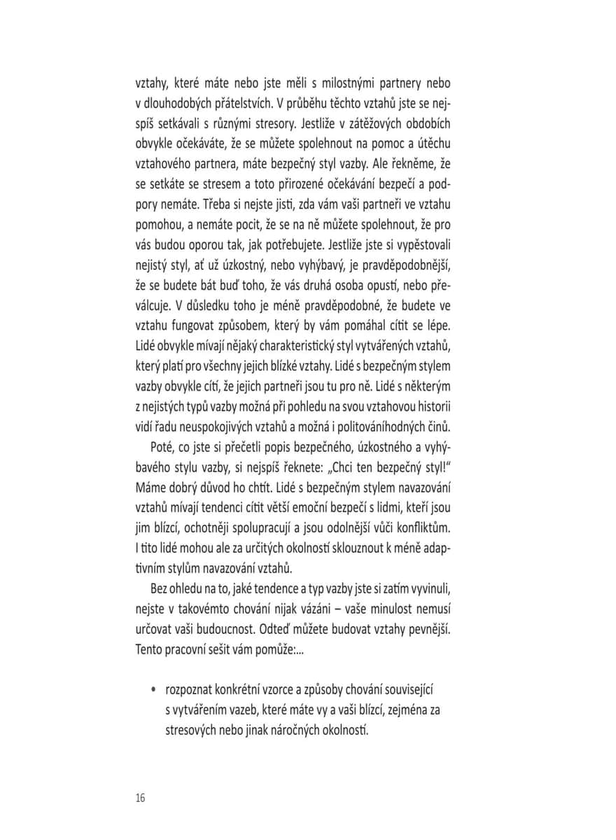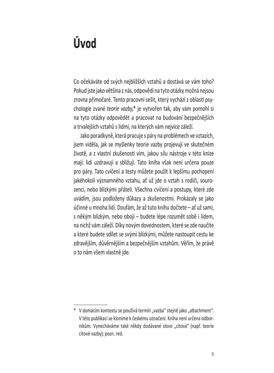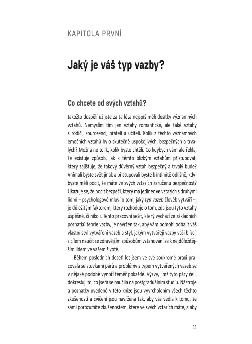 Přehledný a praktický tréninkový rádce vychází z teorie vazby, která zkoumá různé způsoby, jakými si vytváříme vztahy s druhými. Čtenář zjistí, jaký styl vazby (úzkostný, vyhýbavý nebo bezpečný) je mu vlastní, a díky desítkám jednoduchých, ale účinných cvičení a sebehodnotících testů se naučí budovat důvěru, emoční bezpečí, zdravější vztahové návyky, lépe komunikovat a prohlubovat intimitu. Kniha poskytuje pomoc párovou, ale je vhodná i pro jednotlivce, uplatní se v rodině nebo mezi přáteli – ať už právě někoho mají po boku, nebo se teprve hledají. Pomocí strategií založených na této teorii lze dojít k lepšímu chápání vlastních emocí a typů vazby a budovat pevnější, zdravější, autentičtější a trvalejší vztahy díky aktivní práci na jejich zlepšování.