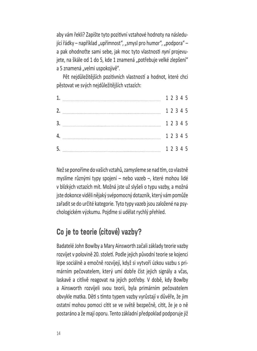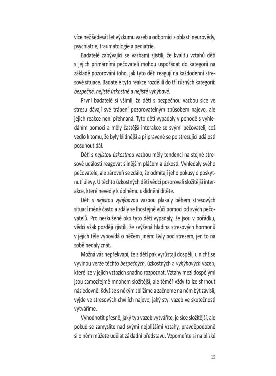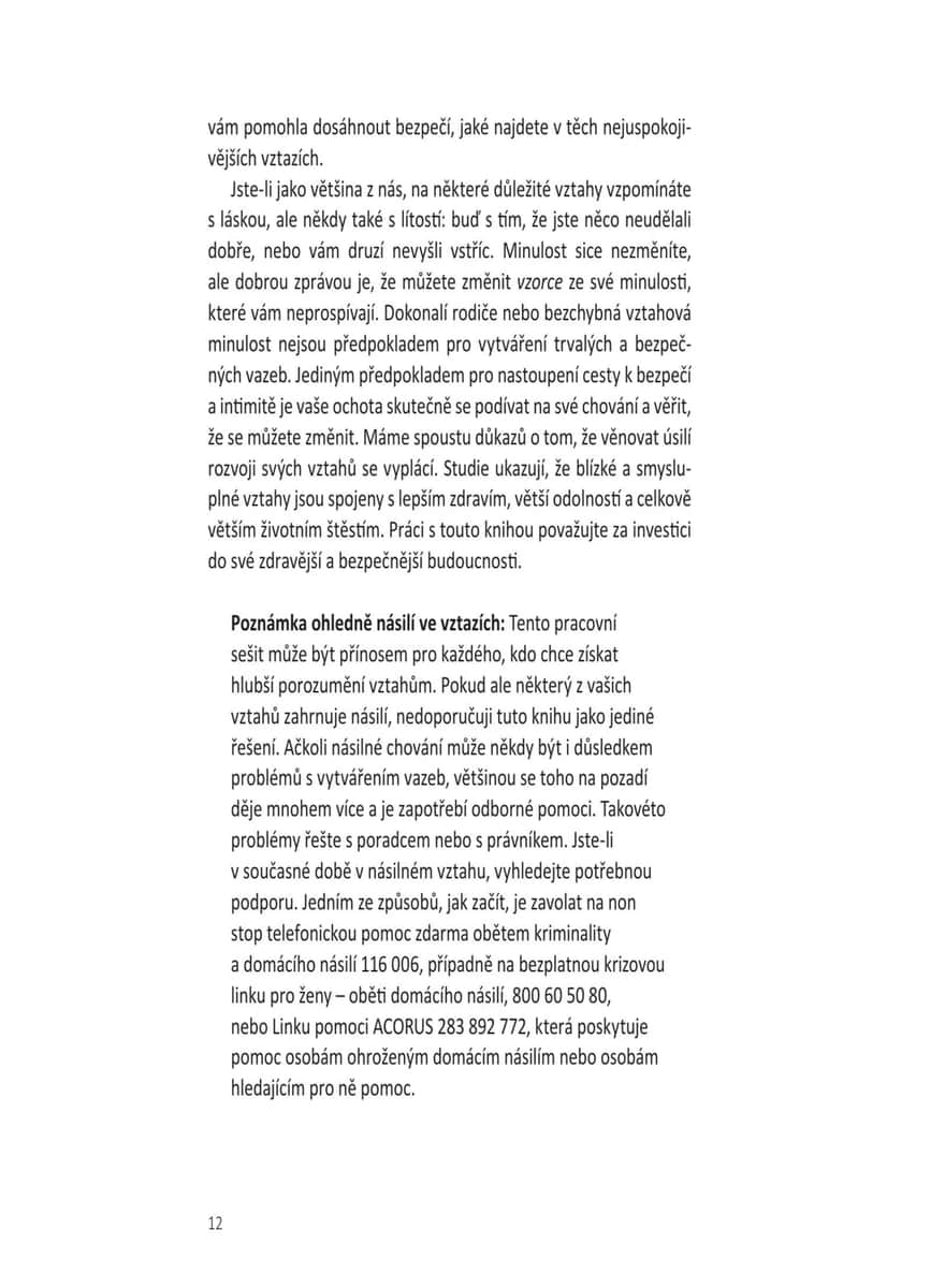 Přehledný a praktický tréninkový rádce vychází z teorie vazby, která zkoumá různé způsoby, jakými si vytváříme vztahy s druhými. Čtenář zjistí, jaký styl vazby (úzkostný, vyhýbavý nebo bezpečný) je mu vlastní, a díky desítkám jednoduchých, ale účinných cvičení a sebehodnotících testů se naučí budovat důvěru, emoční bezpečí, zdravější vztahové návyky, lépe komunikovat a prohlubovat intimitu. Kniha poskytuje pomoc párovou, ale je vhodná i pro jednotlivce, uplatní se v rodině nebo mezi přáteli – ať už právě někoho mají po boku, nebo se teprve hledají. Pomocí strategií založených na této teorii lze dojít k lepšímu chápání vlastních emocí a typů vazby a budovat pevnější, zdravější, autentičtější a trvalejší vztahy díky aktivní práci na jejich zlepšování.