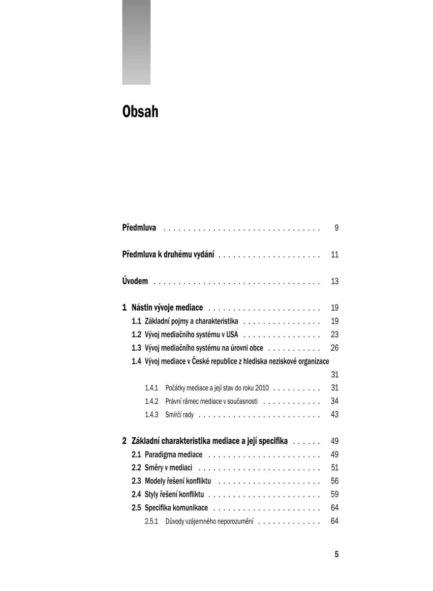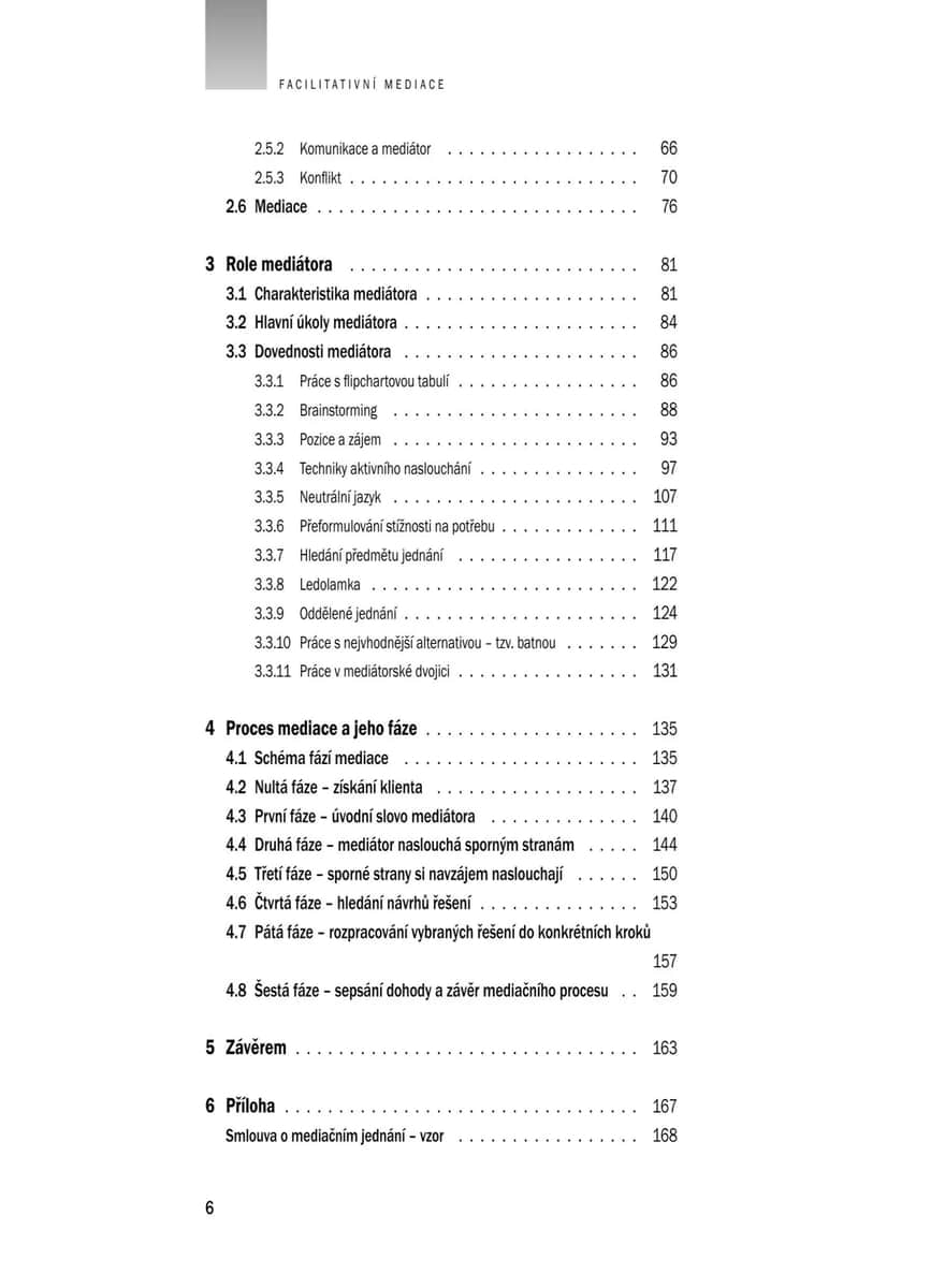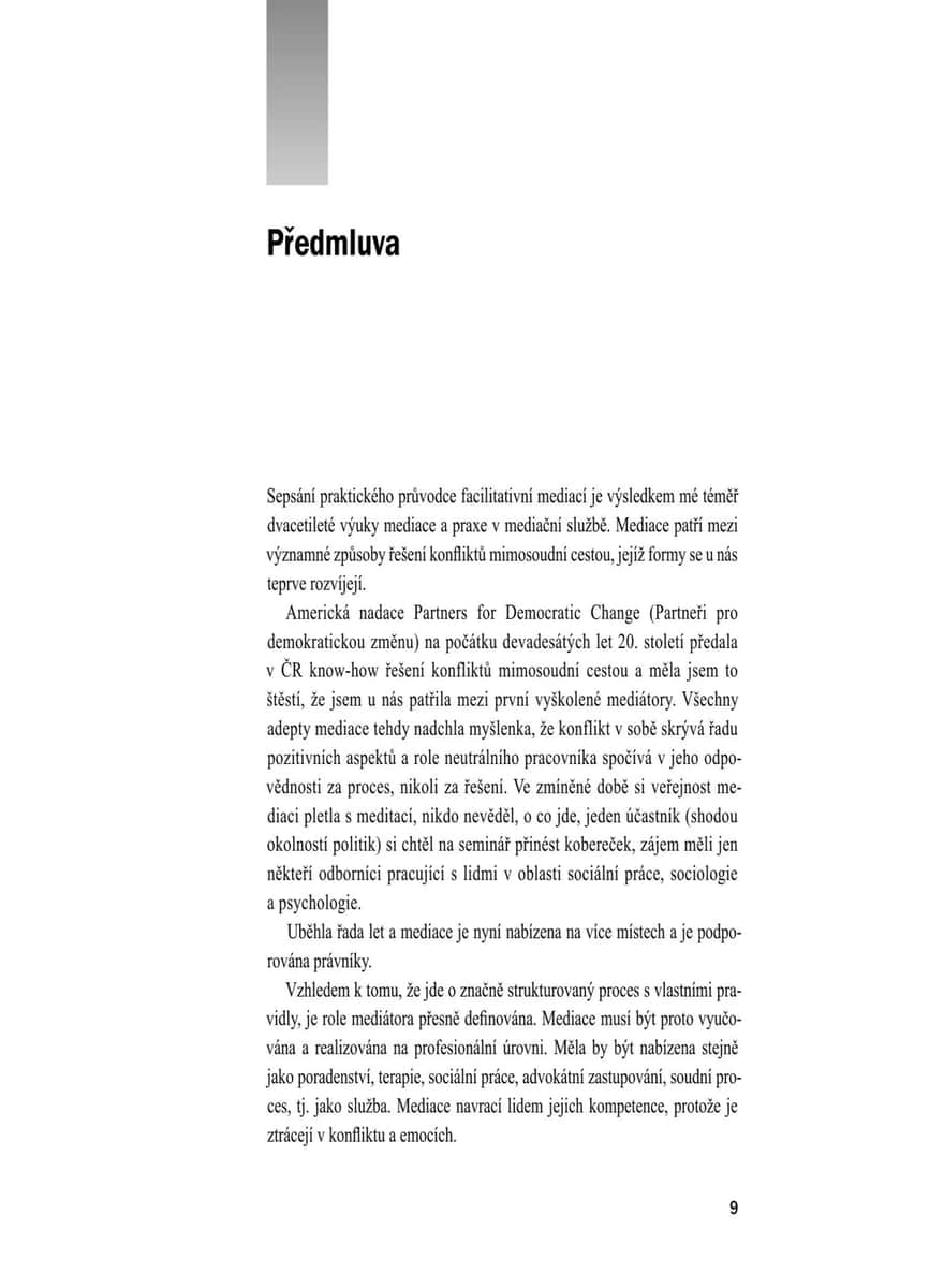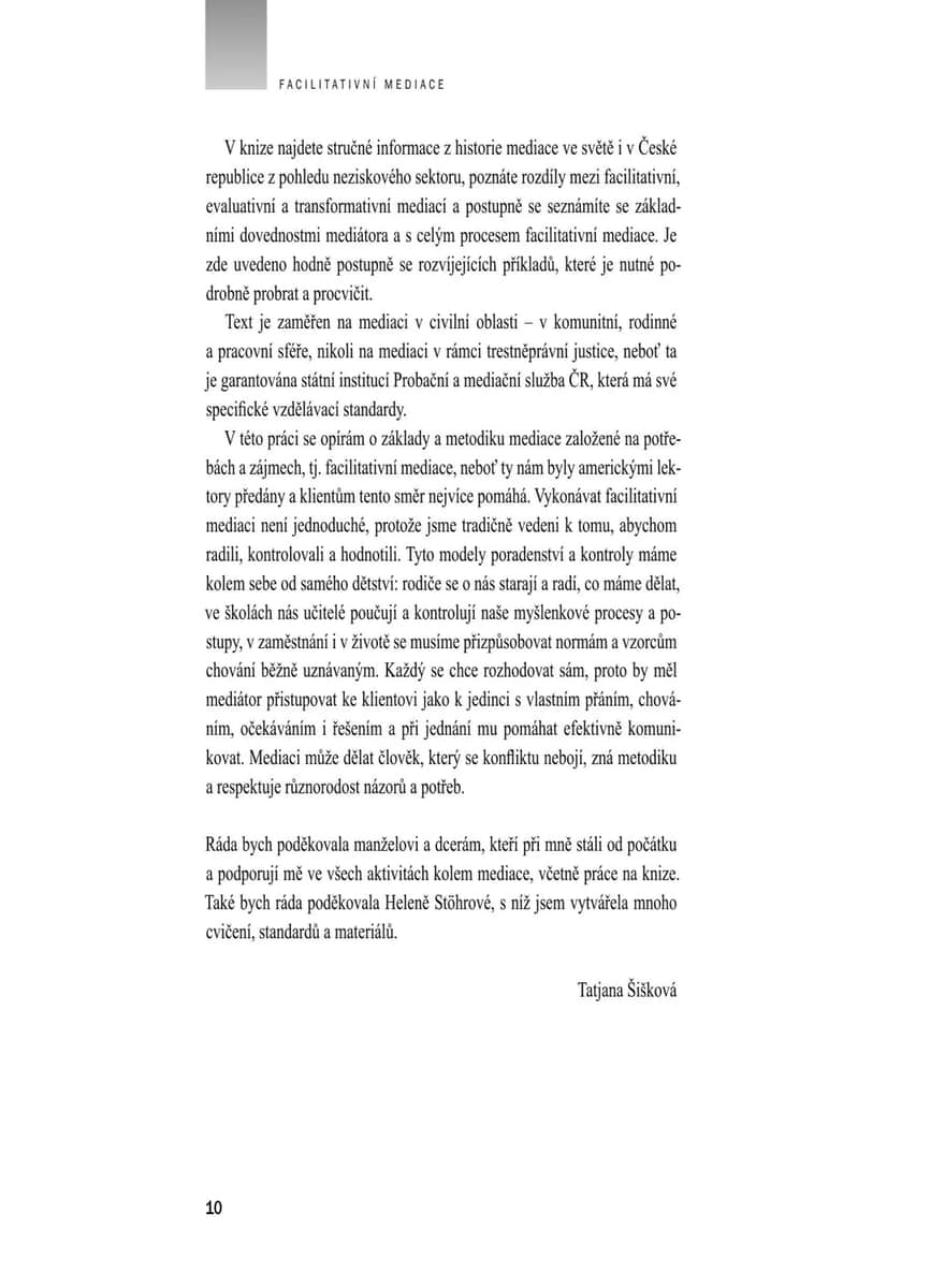 V publikaci najdete stručné informace z historie mediace ve světě i v České republice z pohledu neziskového sektoru, poznáte rozdíly mezi facilitativní, evaluativní a transformativní mediací a postupně se seznámíte se základními dovednostmi mediátora a celým procesem facilitativní mediace. Při ní jednání vede neutrální třetí strana a zúčastněné strany vzájemně respektují dohodu jako výsledek dojednaného řešení. V knize je uvedena řada příkladů, vodítek a poznatků z praxe. Knihu doporučujeme jako základní manuál pro začínající mediátory i praktikující mediátory. Text je zaměřen na mediaci v civilní oblasti – v komunitní, rodinné a pracovní sféře –, tedy nikoli na mediaci v rámci trestněprávní justice. Kniha, kterou po autorčině smrti aktualizovala její blízká spolupracovnice Elena Mešková, je určena pro všechny, kdo ve svém pracovním životě pomáhají řešit rodinné, pracovní, komunitní a interetnické konflikty.