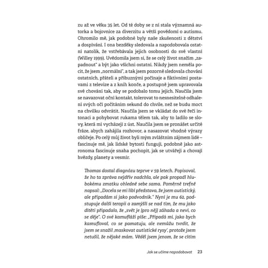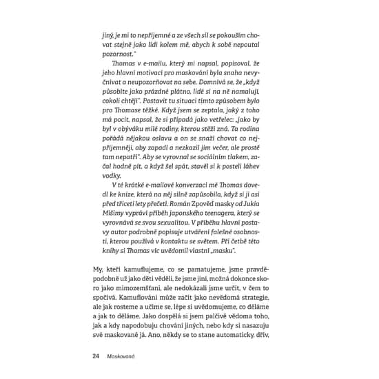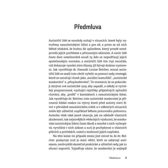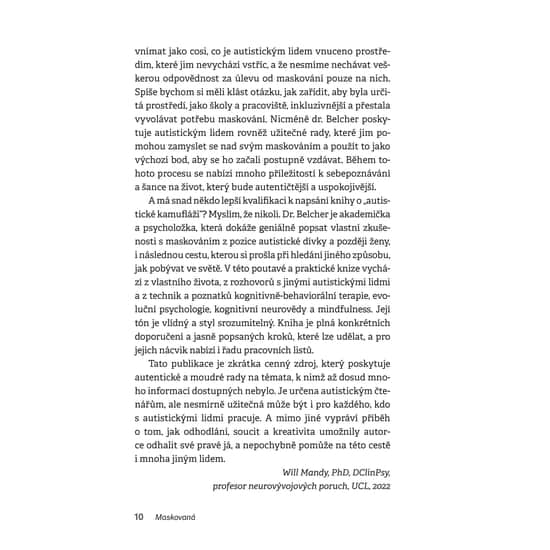 Ženský autismus je téma, kterému mnozí nerozumí. Navíc, autismus je přece ta „mužská“ diagnóza, ženy autistkami ani být nemohou, říká se. Autorka sama uvádí, že se za maskou skrývala celý svůj dosavadní život. Když vyrůstáte s autismem, který chcete zamaskovat, stáváte se pomyslným chameleonem. Jedině tak přežijete ve světě plném neurotypických osob.