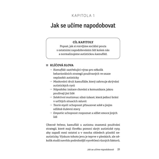 Autorka odkrývá typické situace, kdy se ženy s autismem skrývají za kamufláž. Posezení v baru, schůzka s šéfem, návštěva lékaře…. To vše jsou výzvy, kterým ženy s autismem čelí pomocí svých masek. U odhalení typických situací ale kniha nekončí, vede ženy k tomu, aby pomocí četných příkladů a sebepoznávacích škál odhalily své silné stránky a naučily se obhájit se takové, jaké jsou. I se svým autismem.
