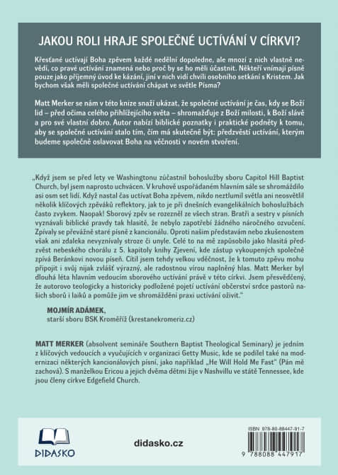 Matt Merker se nám v této knize snaží ukázat, že společné uctívání je čas, kdy se Boží lid – před očima celého přihlížejícího světa – shromažďuje z Boží milosti, k Boží slávě a pro své vlastní dobro. Autor nabízí biblické poznatky i praktické podněty k tomu, aby se společné uctívání stalo tím, čím má skutečně být: předzvěstí uctívání, kterým budeme společně oslavovat Boha na věčnosti v novém stvoření.