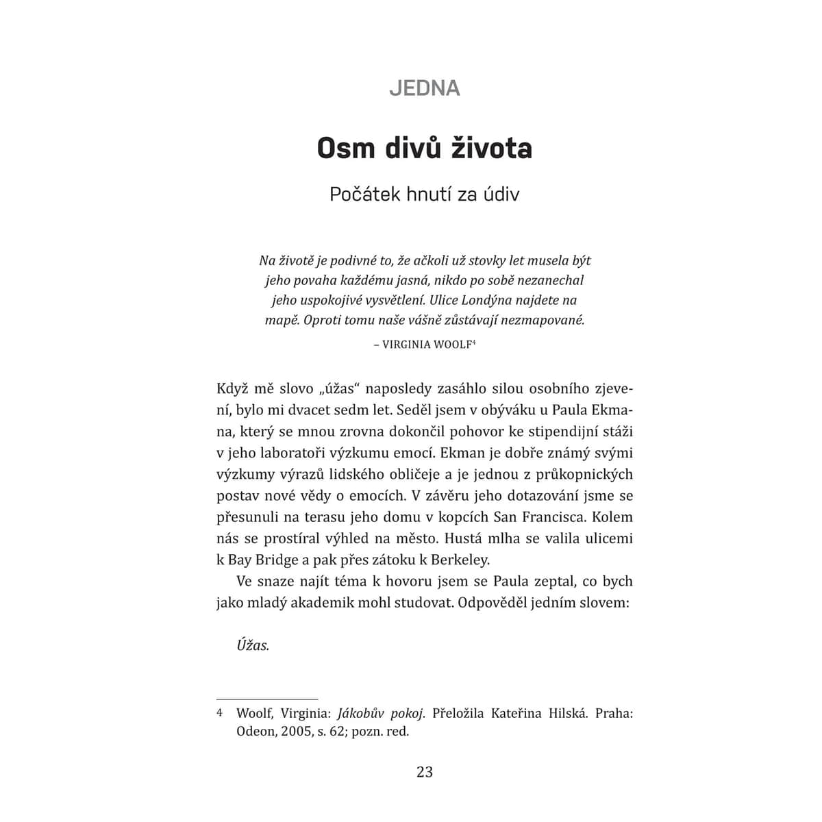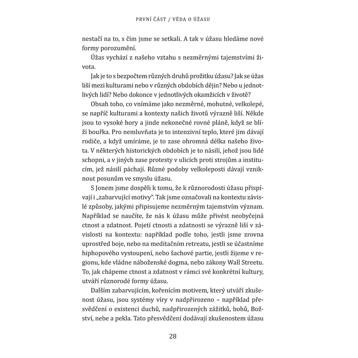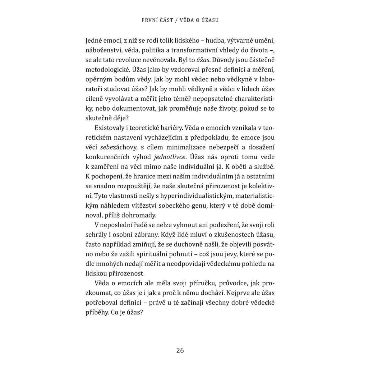 Zatímco emoce jako strach a znechucení byly důkladně prozkoumány, úžas zůstával neprobádaným územím. V knize Úžas Dacher Keltner, americký psycholog a expert na emoce, provádí radikální osobní zkoumání této nepolapitelné emoce a odhaluje sílu úžasu, jeho neurologické základy i transformativní vliv na lidský život, fyzickou a duševní pohodu. Na základě výzkumu a osobních příběhů popisuje, jak může úžas prohloubit naše vztahy, posílit schopnost empatie a spolupráce i kreativitu a zlepšit naše duševní zdraví. Keltner tvrdí, že úžas je klíčem k pozitivnímu prožívání, a odhaluje, jak zostřuje naše uvažování, posiluje naše tělo, prosociální chování a inspiruje umění i náboženství. Spojuje nás a motivuje, čímž přispívá k osobnímu i společenskému blahu. Kniha odhaluje, že hlavním katalyzátorem prožitků úžasu je jednání druhých, následované přírodou a duchovními setkáními. Keltner ukazuje, jak pěstovat úžas v každodenním životě: tato kniha je mnohem víc než jen teoretickým rozborem – je to návod na cestu ke silnějšímu spojení se sebou i s ostatními, k hlubšímu smyslu a radosti.