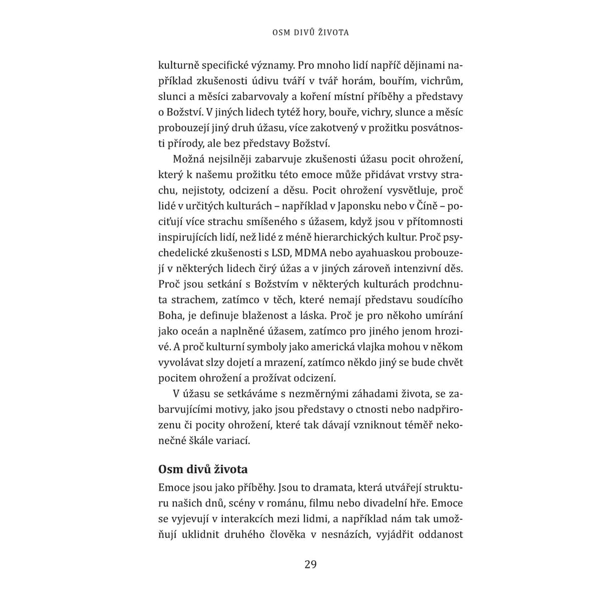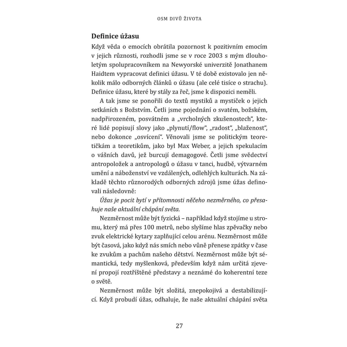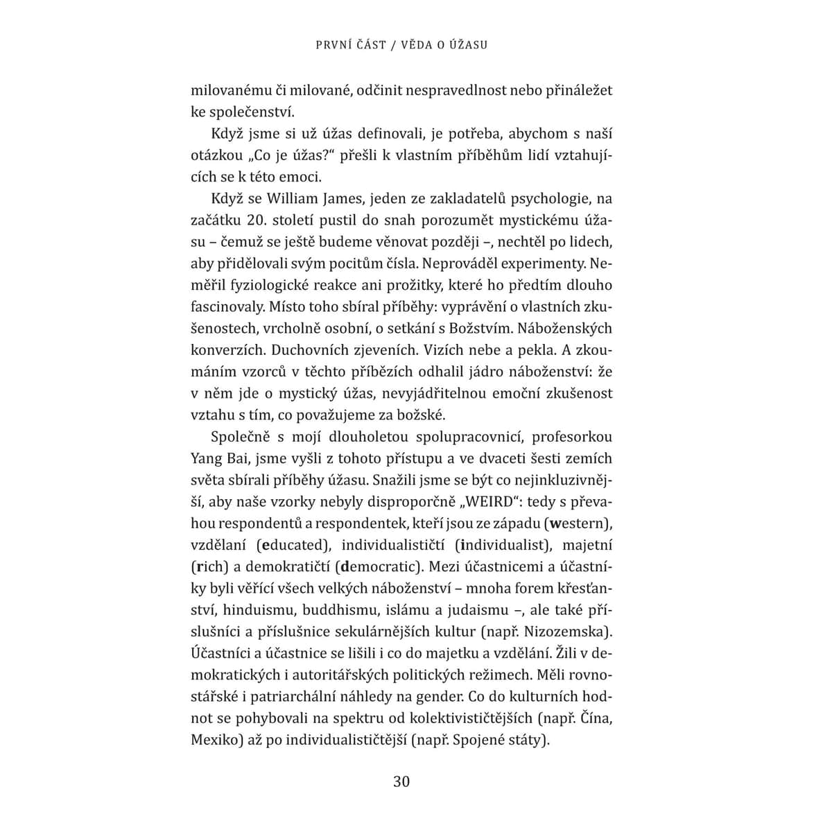 Zatímco emoce jako strach a znechucení byly důkladně prozkoumány, úžas zůstával neprobádaným územím. V knize Úžas Dacher Keltner, americký psycholog a expert na emoce, provádí radikální osobní zkoumání této nepolapitelné emoce a odhaluje sílu úžasu, jeho neurologické základy i transformativní vliv na lidský život, fyzickou a duševní pohodu. Na základě výzkumu a osobních příběhů popisuje, jak může úžas prohloubit naše vztahy, posílit schopnost empatie a spolupráce i kreativitu a zlepšit naše duševní zdraví. Keltner tvrdí, že úžas je klíčem k pozitivnímu prožívání, a odhaluje, jak zostřuje naše uvažování, posiluje naše tělo, prosociální chování a inspiruje umění i náboženství. Spojuje nás a motivuje, čímž přispívá k osobnímu i společenskému blahu. Kniha odhaluje, že hlavním katalyzátorem prožitků úžasu je jednání druhých, následované přírodou a duchovními setkáními. Keltner ukazuje, jak pěstovat úžas v každodenním životě: tato kniha je mnohem víc než jen teoretickým rozborem – je to návod na cestu ke silnějšímu spojení se sebou i s ostatními, k hlubšímu smyslu a radosti.