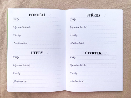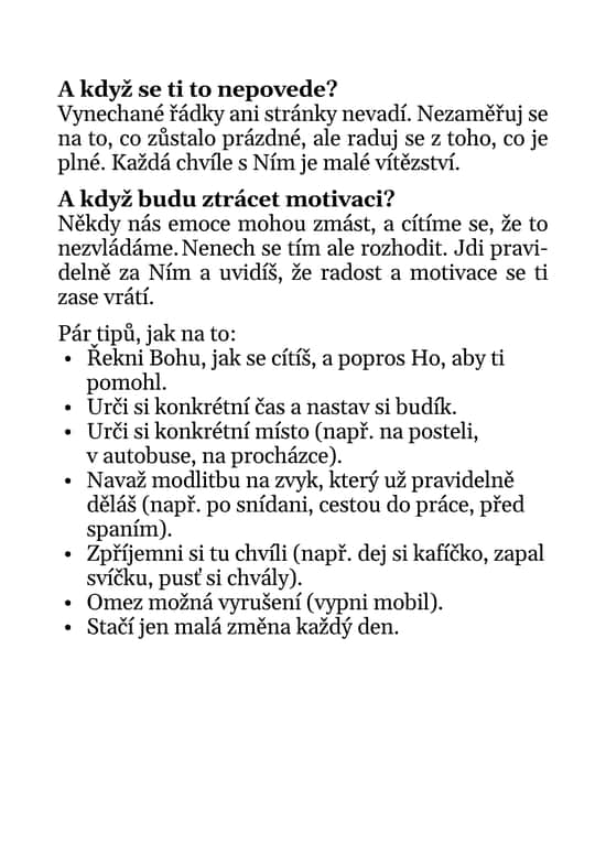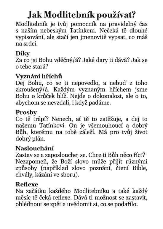Díky Modlitebníku si vybuduj pravidelný návyk na každý den s Bohem a také sleduj Boží dobrotu, jak se o nás stará a na naše modlitby odpovídá.