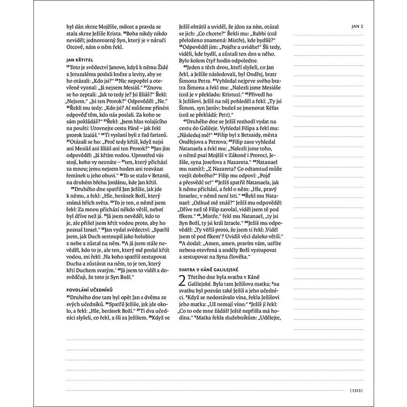 Poznámková Bible nabízí kromě hlavního biblického textu prostor pro vlastní poznámky, a je tak vhodná pro kreativní čtení a samostatné studium.