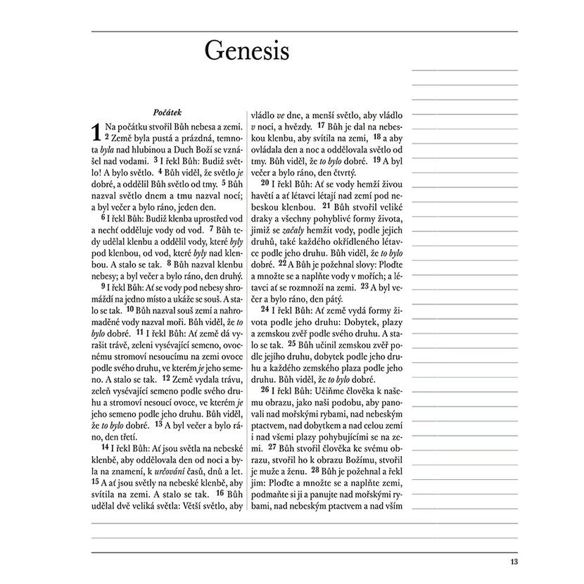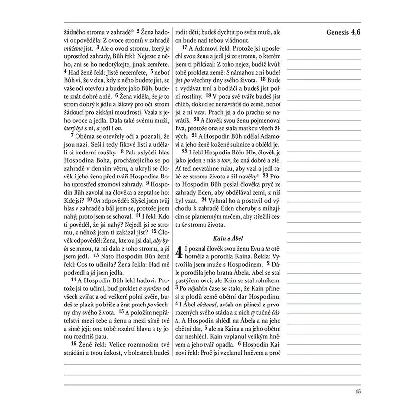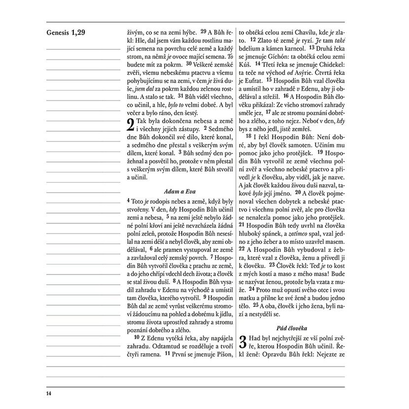 Poznámková Bible nabízí kromě hlavního biblického textu prostor pro vlastní poznámky, a je tak vhodná pro kreativní čtení a samostatné studium.