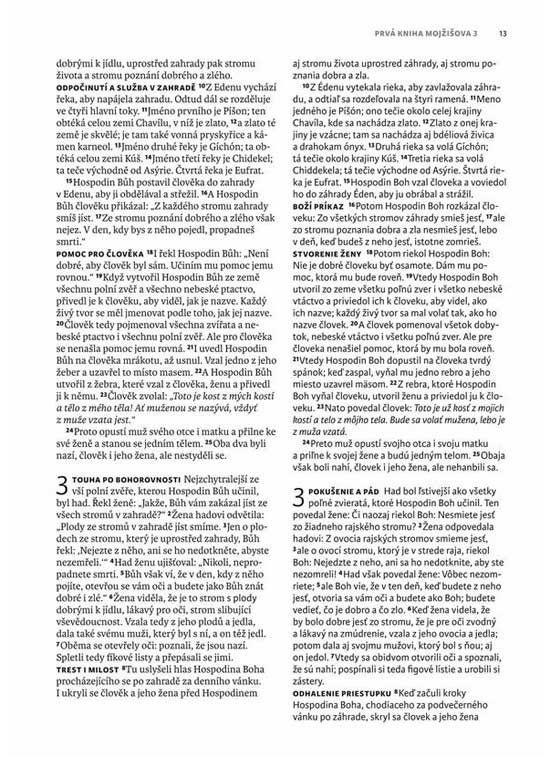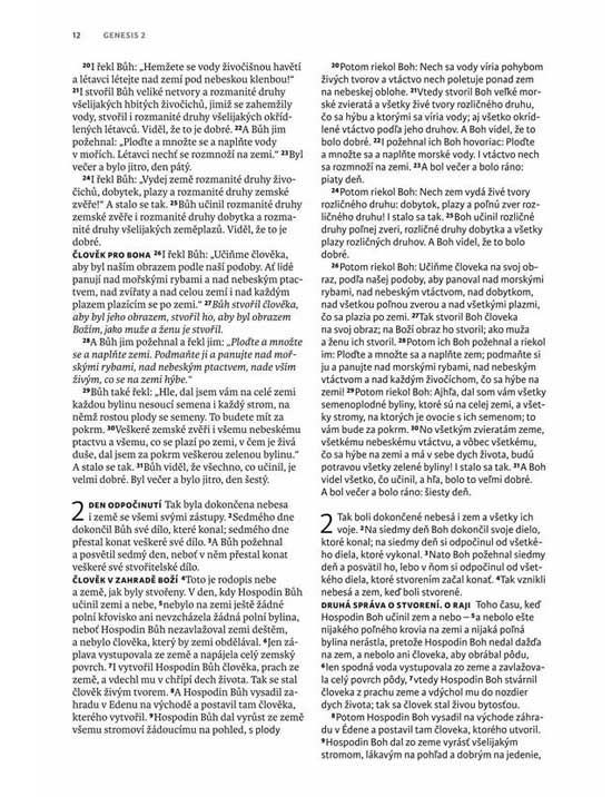 Přehledná grafická úprava knihy vedle sebe klade hlavní biblický text obou použitých překladů bez poznámek a odkazů, a tak maximálně usnadňuje vzájemné porovnávání obou textů. Kniha je velmi vhodná pro samostatné čtení každého z překladů, například ve smíšených česko-slovenských rodinách, sborech či při rozmanitých kulturních akcích.