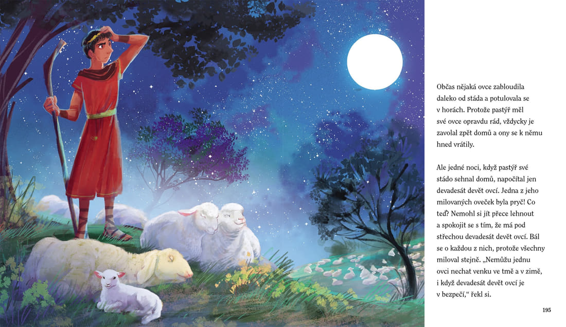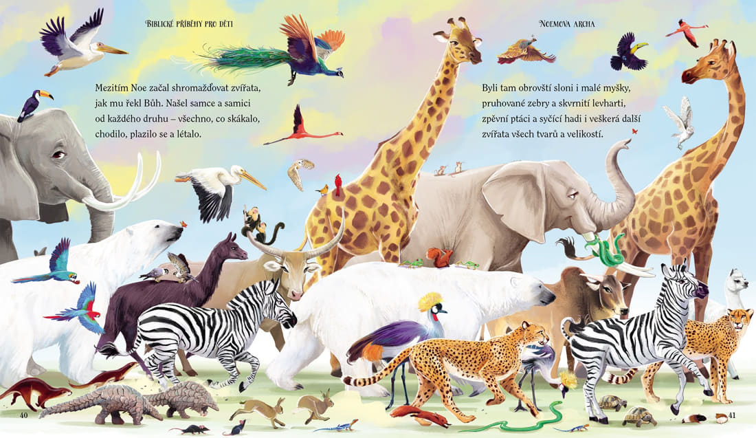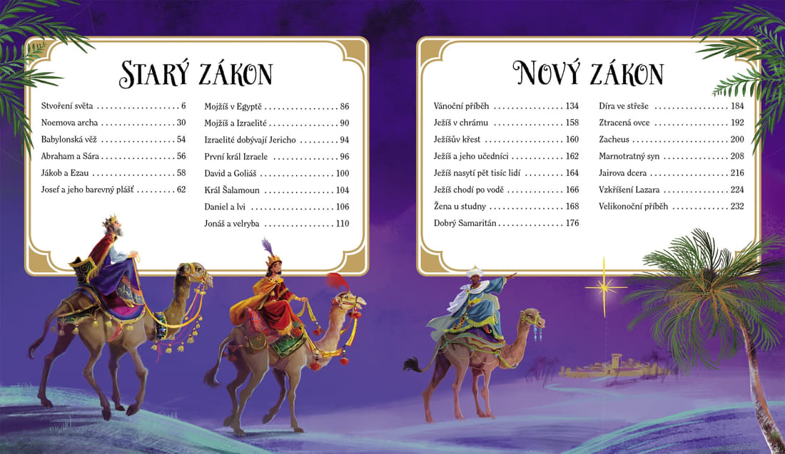 Stvoření světa, Noemova archa, Babylonská věž, Abraham a Sára, Jákob a Ezau, Josef a jeho barevný plášť, Mojžíš v Egyptě, Mojžíš a Izraelité, Izraelité dobývají Jericho, První král Izraele, David a Goliáš, Král Šalamoun, Daniel a lvi, Jonáš a velryba, Vánoční příběh, Ježíš v chrámu, Ježíšův křest, Ježíš a jeho učedníci, Ježíš nasytí pět tisíc lidí, Ježíš chodí po vodě, Žena u studny, Dobrý Samaritán, Díra ve střeše, Ztracená ovce, Zacheus, Marnotratný syn, Jairova dcera, Vzkříšení Lazara a Velikonoční příběh.