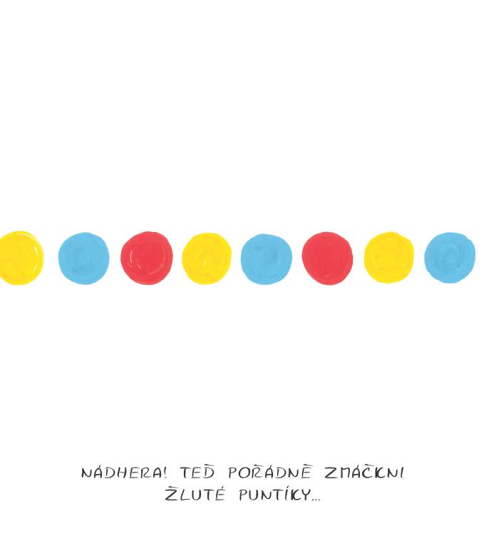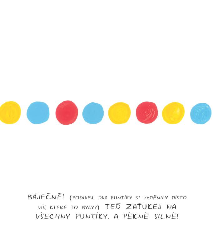 Knížka je knížka, která vám na každé stránce poví, co s ní máte udělat. A pokud ji poslechnete, pochopíte, že máte v ruce opravdu neobyčejnou knížku. Stačí jí zatřást, někde poklepat, jinde fouknout do barevných puntíků a začnou se dít překvapivé věci… Knížka přirozeně rozvíjí pozornost, orientaci na ploše, číselné představy a zrakové vnímání předškolních dětí, připravuje pro čtení a psaní, ale rozhýbá, potěší a rozesměje i dospělé. Knížku ve svých knihovnách ocení rodiče předškoláků, pedagogové předškolních zařízení a speciální pedagogové.