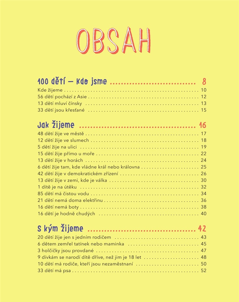 Máš pokoj plný hraček, milující rodiče, více než jeden pár bot, každý rok jezdíš někam na prázdniny a připadá ti to docela normální? V Evropě to může platit pro celou řadu dětí. Jak to ale vypadá, když se podíváš na všechny děti na světě? Chceš vědět, kde a jak žijí jiné děti a kolik z nich umí číst nebo musí pracovat, kolik jich potřebuje brýle, kolik má skutečně boty a vlastní mobilní telefon? Pak držíš v rukou tu správnou knihu!