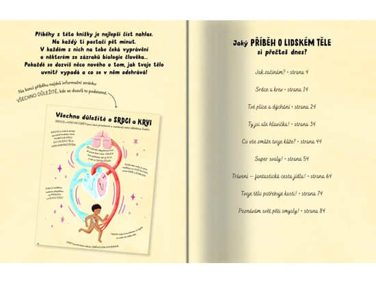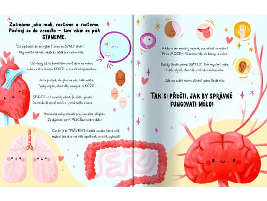 "Zde na světě máme všichni jedno lidské tělo. Tak si přečti, jak by správně fungovati mělo!" V krátkých veršovaných příbězích postupně odhalíte tajemství fungování lidského těla. Můžete si je předčítat nahlas a díky krásným ilustracím tak pochopit složitosti fungování lidského těla i jeho anatomii. Příběhy z této knížky je nejlepší číst nahlas. Na každý postačí pět minut. V každém z nich čeká vyprávění o některém ze zázraků biologie člověka… Pokaždé se dozvíte něco nového o tom, jak tvoje tělo uvnitř vypadá a co se v něm odehrává! Tato kniha jistě potěší malé i velké zvídavé hlavičky!
