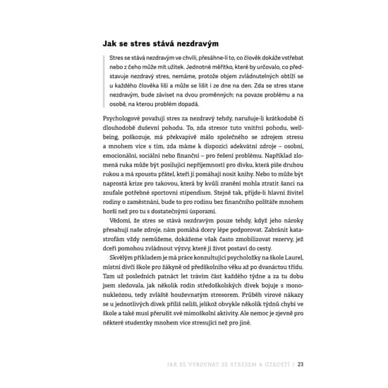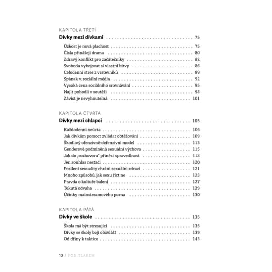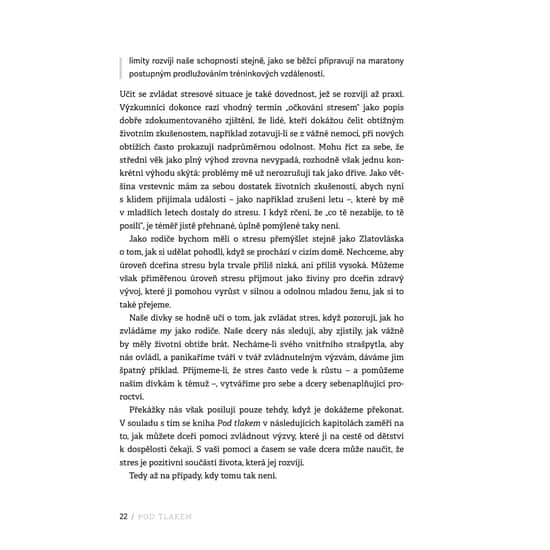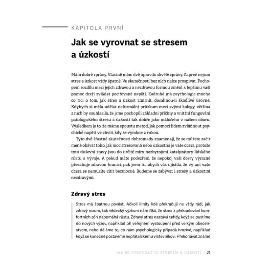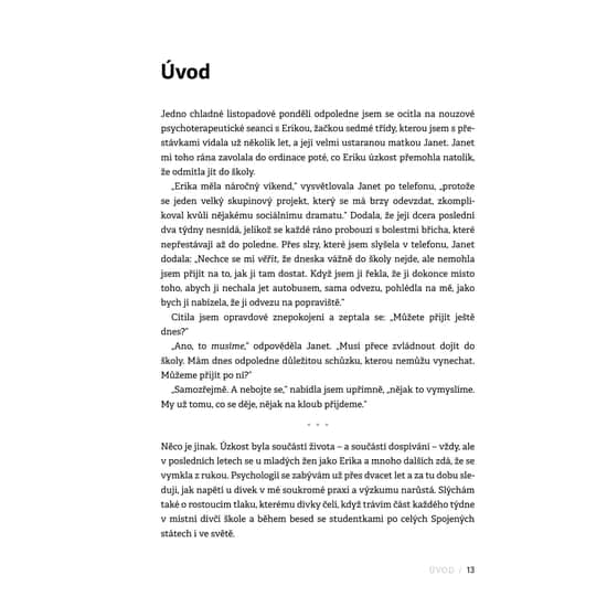 Dnešní dospívající dívky čelí nezvladatelnému stresu, studijnímu tlaku, nárokům sociálních médií, vrstevníků i rodiny a obavám o svou budoucnost a duševní zdraví. Hluboká sonda do jejich duše od renomované psycholožky Lisy Damour je zaměřená na zvládání této míry stresu, tlaku na výkon a společenských požadavků, která vede k úzkostem u dívek více než u chlapců. Nabízí rodičům, pedagogům a odborníkům cenné nástroje, jak podpořit dívky v náročných obdobích jejich života od základní až po vysokou školu a pomoci jim vybudovat zdravý vztah k výkonům a osobnímu úspěchu. Přináší praktické rady a uklidňující přehled možností, jak stres omezit i jak může být tlak prospěšný, pokud jej správně přijmeme. S vědeckými podklady, praktickými radami a uklidňujícím tónem se stává neocenitelným průvodcem pro všechny, kdo se starají o pohodu mladých žen v dnešní hektické společnosti. Kniha byla přeložena do 20 jazyků a je vysoce ceněna odborníky i rodiči.