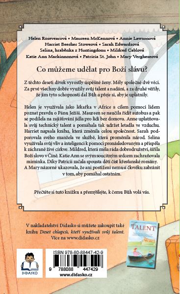 Příběh o deseti dívkách z historie, které věřily, že Boží vůlí je, aby uplatnily talent a nadání, které jim Bůh dal, pro Jeho slávu. Přečtěte si tuto knížku a přemýšlejte, k čemu Bůh volá vás. Co můžeme udělat pro Boží slávu?