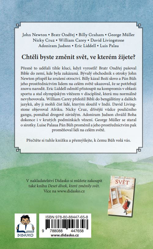 Bratr Ondřej pašoval Bible do zemí, kde byla zakázaná. Bývalý obchodník s otroky John Newton přispěl ke zrušení otroctví. Billy kázal Boží slovo a Pán Bůh jeho prostřednictvím lidem na celém světě ukazoval, že se potřebují znovu narodit. Eric Liddell odmítl přistoupit na kompromis v oblasti sportu a stal olympijským vítězem v disciplíně, která mu normálně nevyhovovala. William Carey přeložil Bibli do bengálštiny a dalších jazyků, aby ji mohli číst lidé, kterým sloužil v Indii. David Livingstone objevoval Afriku. Nicky Cruz, dřívější vůdce pouličního gangu, pomáhal drogově závislým. Adoniram Judson chválil Boha dokonce i v krutých podmínkách vězení. George Müller se staral o sirotky. Luise Palaua Pán Bůh proměnil a jeho prostřednictvím pak proměňoval lidi na celém světě. Přečtěte si tuhle knížku a přemýšlejte, k čemu Bůh volá vás.