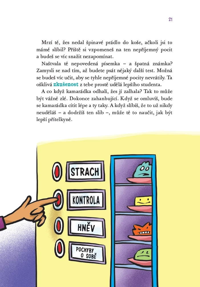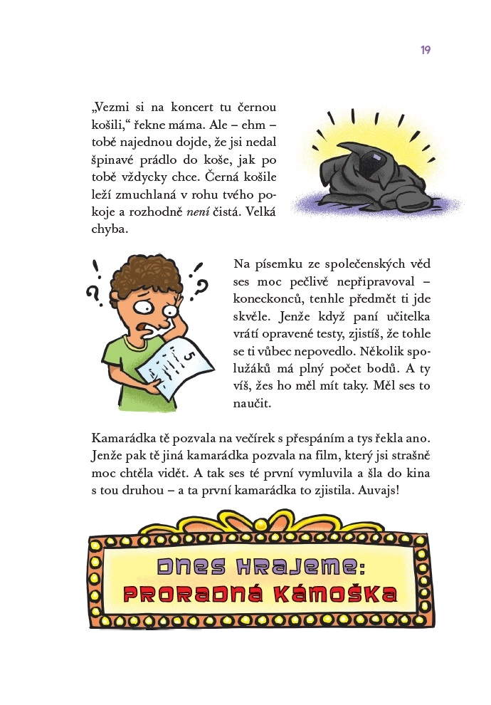 Když uděláme chybu, cítíme se děsně a zdá se nám, že se blíží konec světa. V téhle knize zjistíš, že z chyb se nestřílí a naučíš se, jak s nimi pracovat. Říká se, že kdo nic nedělá, ten nic nezkazí, a něco na tom opravdu je. Když totiž nebudeš dělat nic, sice nikdy nezachybuješ, ale – jak to jen říct – prostě nic neuděláš. A to je vlastně otrava. Zkus se s námi podívat na chyby jako na součást života. Zjistíš, že chyby nedělají jen děti, ale – kupodivu – i ctění dospělí. Přijdeš také na to, že když budeš zkoušet dělat všechno na jedničku, zabere ti to spoustu energie a nakonec to možná stejně nebude ono. Nikdo není perfektní, ani ty nemusíš.