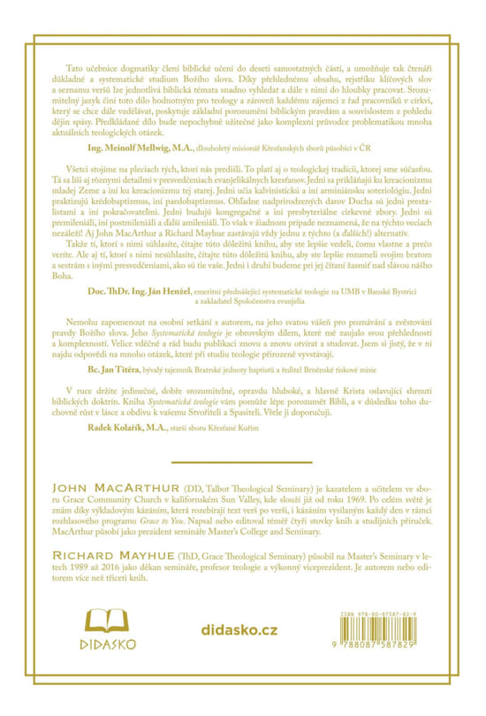 Všetci stojíme na pleciach tých, ktorí nás predišli. To platí aj o teologickej tradícii, ktorej sme súčasťou. Tá sa líši aj rôznymi detailmi v presvedčeniach evanjelikálnych kresťanov. Jedni sa prikláňajú ku kreacionizmu mladej Zeme a iní ku kreacionizmu tej starej. Jedni učia kalvinistickú a iní arminiánsku soteriológiu. Jedni praktizujú krédobaptizmus, iní paedobaptizmus. Ohľadne nadprirodzených darov Ducha sú jedni prestalistami a iní pokračovateľmi. Jedni budujú kongregačné a iní presbyteriálne cirkevné zbory. Jedni sú premileniáli, iní postmileniáli a ďalší amileniáli. To však v žiadnom prípade neznamená, že na týchto veciach nezáleží! Aj John MacArthur a Richard Mayhue zastávajú vždy jednu z týchto (a ďalších!) alternatív. Takže tí, ktorí s nimi súhlasíte, čítajte túto dôležitú knihu, aby ste lepšie vedeli, čomu vlastne a prečo veríte. Ale aj tí, ktorí s nimi nesúhlasíte, čítajte túto dôležitú knihu, aby ste lepšie rozumeli svojim bratom a sestrám s inými presvedčeniami, ako sú tie vaše. Jedni i druhí budeme pri jej čítaní žasnúť nad slávou nášho Boha. – Doc. ThDr. Ing. Ján Henžel, emeritný učiteľ systematickej teológie na UMB v Banskej Bystrici a zakladateľ Spoločenstva evanjelia