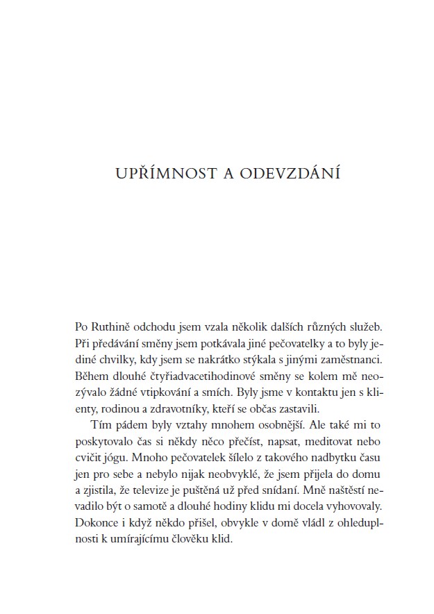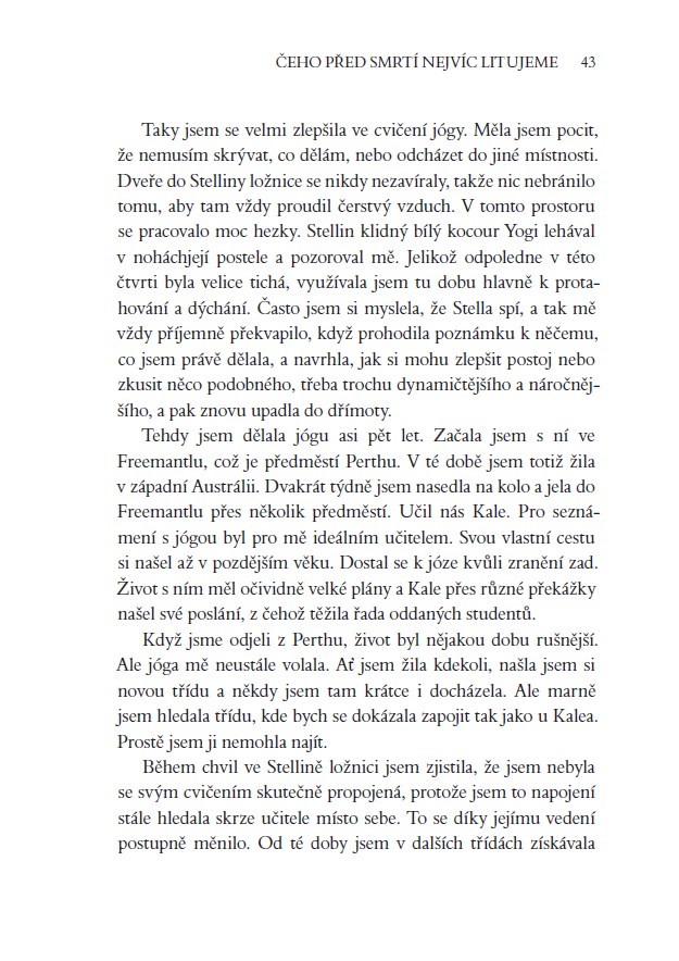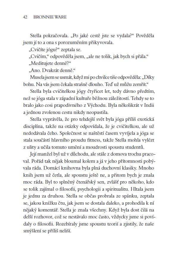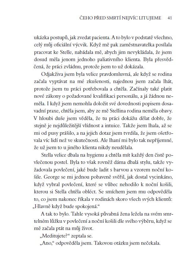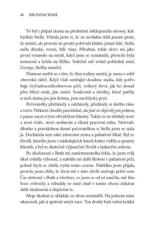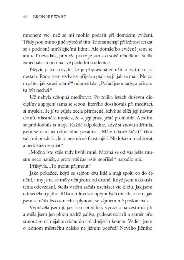Kniha čerpá z osobní zkušenosti autorky, která několik let působila v paliativní péči. Setkání s lidmi, jimž perspektiva blízké smrti naléhavě otevřela palčivá osobní témata a možná trochu pozapomenuté hodnoty, proměnila i její vlastní život. Rozhovory s umírajícími naznačily několik hlavních směrů lítosti – kéž bych měl odvahu žít opravdu podle sebe, ne podle očekávání druhých, kéž bych tolik nepracoval, kéž bych měl odvahu vyjádřit své city, kéž bych si udržel vztahy se svými přáteli, kéž bych si dovolil být šťastnější… Příběhy lidí loučících se se životem se prolínají s osobním příběhem autorky, hledající pozitivní smysl plného prožívání přítomnosti při stejně plném vědomí vlastní konečnosti.