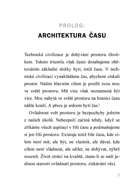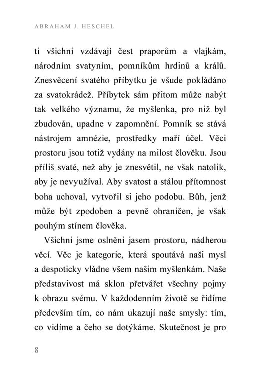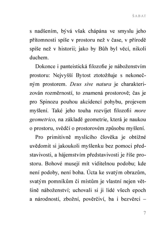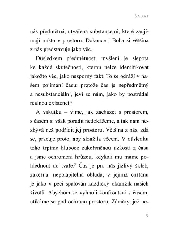 Významný židovský myslitel 20. století ve své drobné, ale duchovně nesmírně podnětné knize poukazuje na podstatný rys moderního člověka – jeho neschopnost vnímat božskou dimenzi času jak ve dnech všedních, tak především ve dni odpočinku. Jak říká, příliš dobýváme prostor, místo abychom posvěcovali čas. Díky svému mimořádnému vhledu do rabínské a chasidské tradice srozumitelným a inspirativním způsobem přibližuje význam šabatu a dává současnému člověku podněty k tomu, aby se zamyslel nad tím, jak se vztahuje k času, práci, odpočinku či oslavě stvoření.
