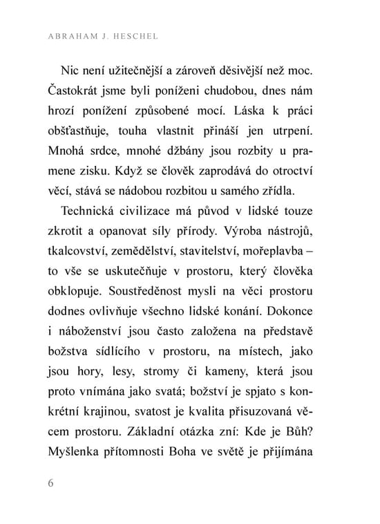 Abraham Joshua Heschel (1907–1972) je jedním z nejvýznamnějších židovských myslitelů 20. století. Pocházel z polského chasidského prostředí, studoval ve Vilně a Berlíně, stal se znalcem židovské literatury a mystiky. Před nacismem utekl do Spojených států, od roku 1946 působil jako profesor na Jewish Theological Seminary v New Yorku. Ve svém díle představil hlubokou a živou spiritualitu vycházející z tradiční, především prorocké a chasidské tradice, ale oslovující člověka moderní doby. Věnoval se i mezináboženskému dialogu a společenskému aktivismu.