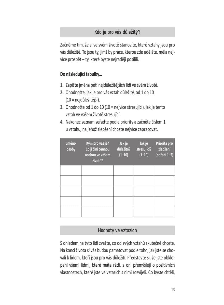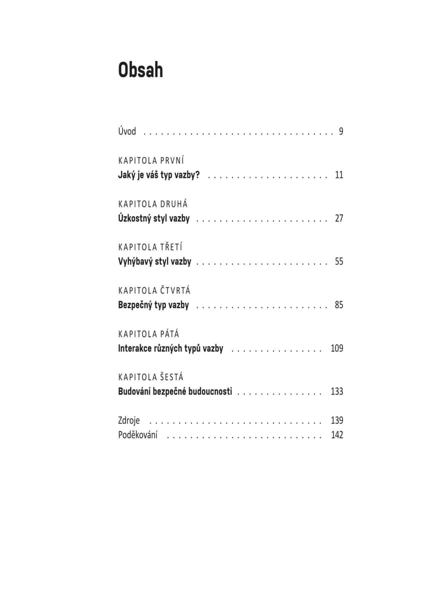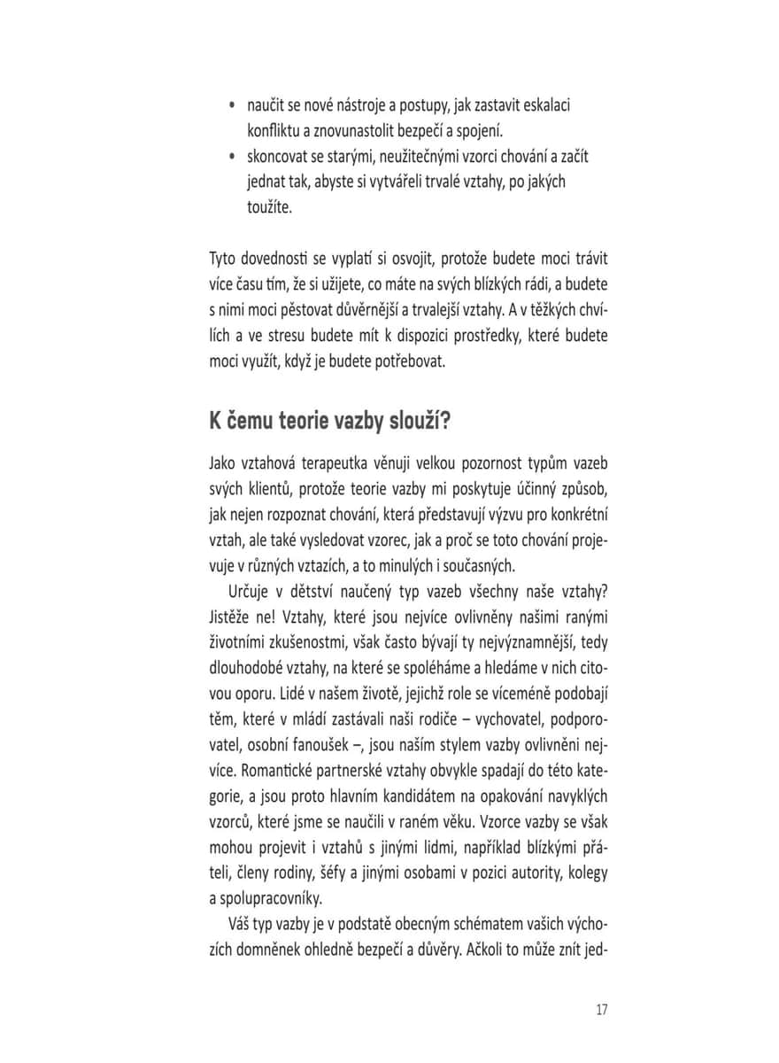 Přehledný a praktický tréninkový rádce vychází z teorie vazby, která zkoumá různé způsoby, jakými si vytváříme vztahy s druhými. Čtenář zjistí, jaký styl vazby (úzkostný, vyhýbavý nebo bezpečný) je mu vlastní, a díky desítkám jednoduchých, ale účinných cvičení a sebehodnotících testů se naučí budovat důvěru, emoční bezpečí, zdravější vztahové návyky, lépe komunikovat a prohlubovat intimitu. Kniha poskytuje pomoc párovou, ale je vhodná i pro jednotlivce, uplatní se v rodině nebo mezi přáteli – ať už právě někoho mají po boku, nebo se teprve hledají. Pomocí strategií založených na této teorii lze dojít k lepšímu chápání vlastních emocí a typů vazby a budovat pevnější, zdravější, autentičtější a trvalejší vztahy díky aktivní práci na jejich zlepšování.