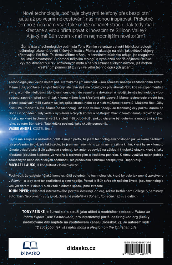 „Technologie jsou všude kolem nás. Nemůžeme jim uniknout. Jsou součástí našeho každodenního života. Máme auta, počítače a chytré telefony, ale také slyšíme o biologických laboratořích, kde se experimentuje s viry, o umělé inteligenci, klonování, cestování do vesmíru, a dokonce i o naději, že nás technologie v budoucnu zachrání před smrtí. Jak k tomu máme jako křesťané přistupovat? Máme technologie prostě bez otázek používat? Měli bychom se jich spíše stranit, nebo se z nich můžeme radovat? Můžeme říct: „Díky Kristu za iPhone“? Nevkládáme do technologií až moc velkou naději? Je technologický pokrok darem od Boha i v případech, kdy vede k vytváření ničivých zbraní a nástrojů? Mluví o tomto tématu Bible? To jsou otázky, na které bychom si ve 21. století měli odpovědět, pokud chceme být dobrými a moudrými správci toho, co nám Bůh dává. Tato knížka poslouží jako skvělý pomocník.“