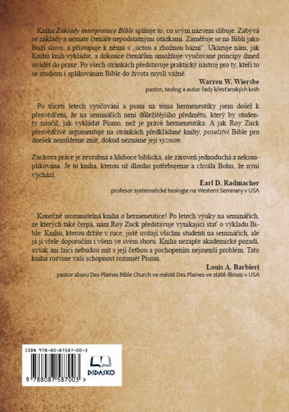 Po třiceti letech vyučování a psaní na téma hermeneutiky jsem došel k přesvědčení, že na seminářích není důležitějšího předmětu, který by studenty naučil, jak vykládat Písmo, než je právě hermeneutika. A jak Roy Zuck přesvědčivě argumentuje na stránkách předkládané knihy, poselství Bible pro dnešek nemůžeme znát, dokud neznáme její význam. Zuckova práce je zevrubná a hluboce biblická, ale zároveň jednoduchá a nekomplikovaná. Je to kniha, kterou už dlouho potřebujeme a chvála Bohu, že nyní vychází.