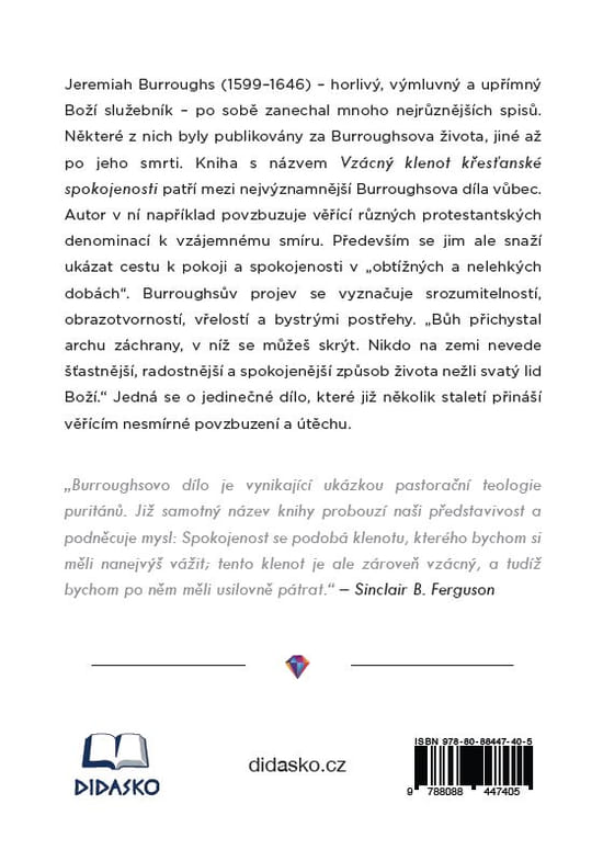 „Burroughsovo dílo je vynikající ukázkou pastorační teologie puritánů. Již samotný název knihy probouzí naši představivost a podněcuje mysl: Spokojenost se podobá klenotu, kterého bychom si měli nanejvýš vážit; tento klenot je ale zároveň vzácný, a tudíž bychom po něm měli usilovně pátrat.“