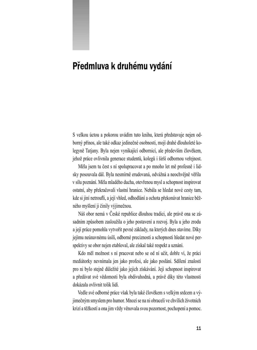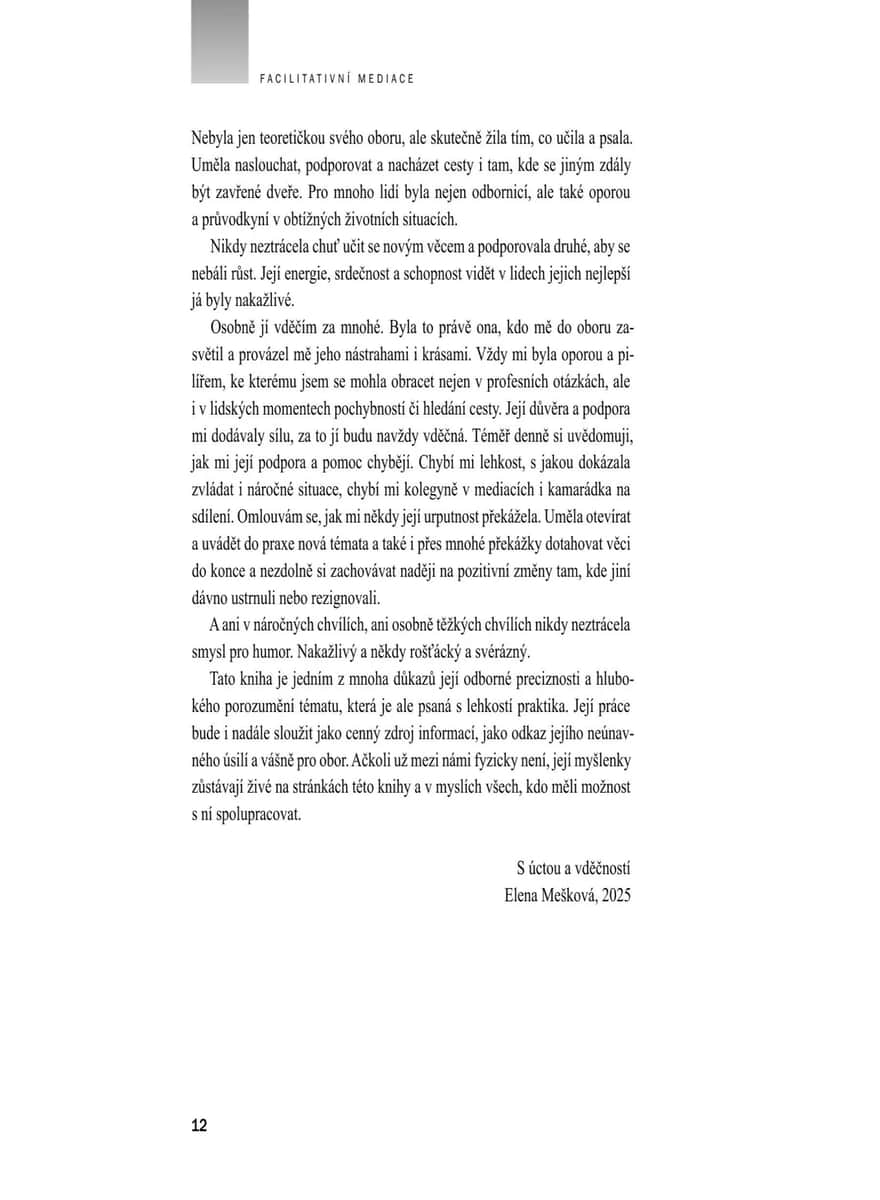 V publikaci najdete stručné informace z historie mediace ve světě i v České republice z pohledu neziskového sektoru, poznáte rozdíly mezi facilitativní, evaluativní a transformativní mediací a postupně se seznámíte se základními dovednostmi mediátora a celým procesem facilitativní mediace. Při ní jednání vede neutrální třetí strana a zúčastněné strany vzájemně respektují dohodu jako výsledek dojednaného řešení. V knize je uvedena řada příkladů, vodítek a poznatků z praxe. Knihu doporučujeme jako základní manuál pro začínající mediátory i praktikující mediátory. Text je zaměřen na mediaci v civilní oblasti – v komunitní, rodinné a pracovní sféře –, tedy nikoli na mediaci v rámci trestněprávní justice. Kniha, kterou po autorčině smrti aktualizovala její blízká spolupracovnice Elena Mešková, je určena pro všechny, kdo ve svém pracovním životě pomáhají řešit rodinné, pracovní, komunitní a interetnické konflikty.