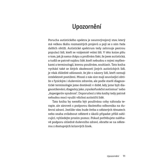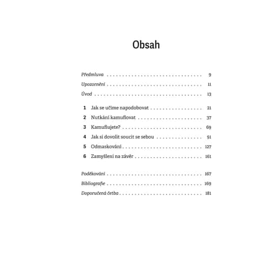 Autorka odkrývá typické situace, kdy se ženy s autismem skrývají za kamufláž. Posezení v baru, schůzka s šéfem, návštěva lékaře…. To vše jsou výzvy, kterým ženy s autismem čelí pomocí svých masek. U odhalení typických situací ale kniha nekončí, vede ženy k tomu, aby pomocí četných příkladů a sebepoznávacích škál odhalily své silné stránky a naučily se obhájit se takové, jaké jsou. I se svým autismem.