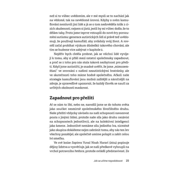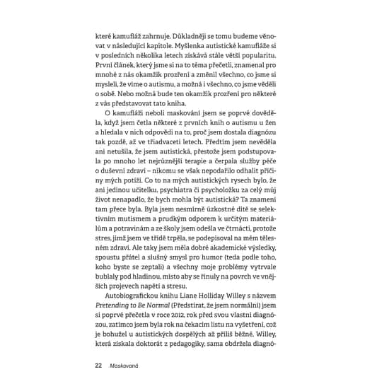 Ženský autismus je téma, kterému mnozí nerozumí. Navíc, autismus je přece ta „mužská“ diagnóza, ženy autistkami ani být nemohou, říká se. Autorka sama uvádí, že se za maskou skrývala celý svůj dosavadní život. Když vyrůstáte s autismem, který chcete zamaskovat, stáváte se pomyslným chameleonem. Jedině tak přežijete ve světě plném neurotypických osob.