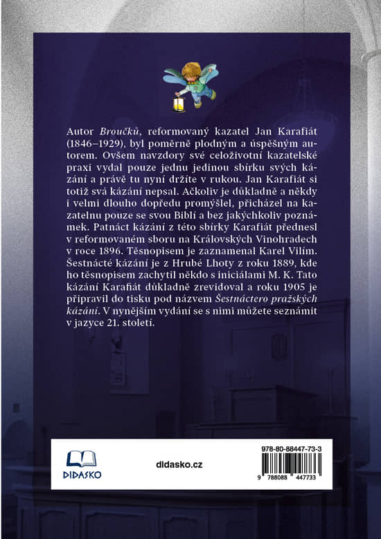 Spisovatel Broučků, reformovaný kazatel Jan Karafiát (1846–1929), byl poměrně plodným a úspěšným autorem. Ovšem navzdory své celoživotní kazatelské praxi vydal pouze jednu jedinou sbírku svých kázání a právě tu nyní držíte v rukou. Jan Karafiát si totiž svá kázání nepsal. Ačkoliv je důkladně a někdy i velmi dlouho dopředu promýšlel, přicházel na kazatelnu pouze se svou Biblí a bez jakýchkoliv poznámek. Patnáct kázání z této sbírky Karafiát přednesl v reformovaném sboru na Královských Vinohradech v roce 1896. Těsnopisem je zaznamenal Karel Vilím. Šestnácté kázání je z Hrubé Lhoty z roku 1889, kde ho těsnopisem zachytil někdo s iniciálami M. K. Tato kázání Kara?át důkladně zrevidoval a roku 1905 je připravil do tisku pod názvem Šestnáctero Pražských Kázání. V nynějším vydání se s nimi můžete seznámit v jazyce 21. století.