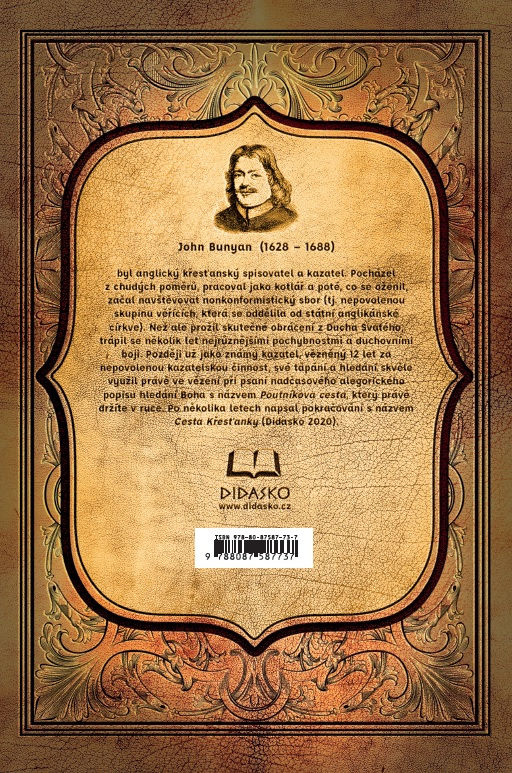 John Bunyan byl anglický křesťanský spisovatel a kazatel. Pocházel z chudých poměrů, pracoval jako kotlář a poté, co se oženil, začal navštěvoval nonkonformistický sbor (tj. nepovolenou skupinu věřících, která se oddělila od státní anglikánské církve). Než ale prožil skutečné obrácení z Ducha Svatého, trápil se několik let nejrůznějšími pochybnostmi a duchovními boji. Později už jako známý kazatel, vězněný 12 let za nepovolenou kazatelskou činnost, své trápení a hledání skvěle využil právě ve vězení při psaní nadčasového alegorického popisu hledání Boha s názvem Poutníkova cesta, který právě držíte v ruce. Po několika letech napsal pokračování s názvem Cesta Křesťanky.