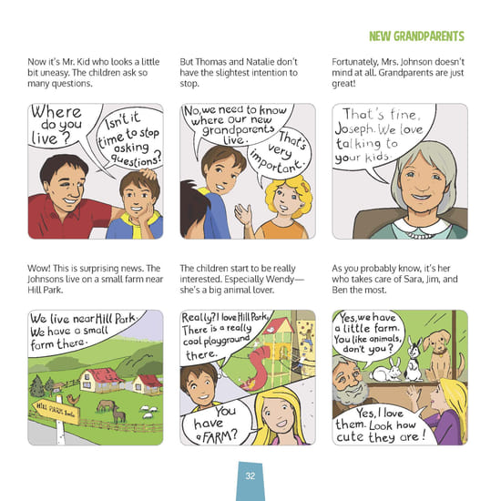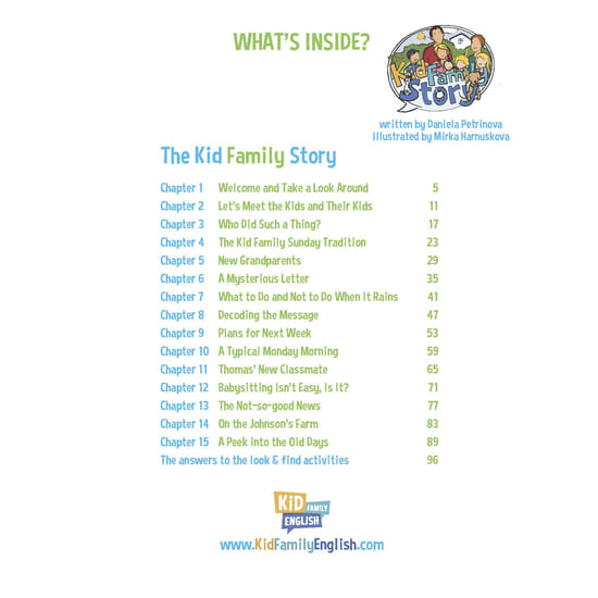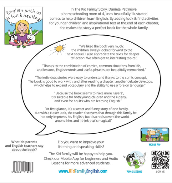 Chcete, aby se vaše děti pobavily, popřemýšlely o tom, co je v životě důležité a ještě k tomu pořádně potrénovaly angličtinu? V komiksové knížce The Kid Family Story na ně čeká vtipný příběh o rodině Kid, milé komiksové obrázky, hledací úkoly i delší texty k zamyšlení a diskusi. Kniha je součástí projektu Kid Family English, který má za cíl pomoci dětem naučit se anglicky zábavným a zdravým způsobem. Kromě tištěných materiálů nabízí i mobilní aplikaci a unikátní audio nahrávky.