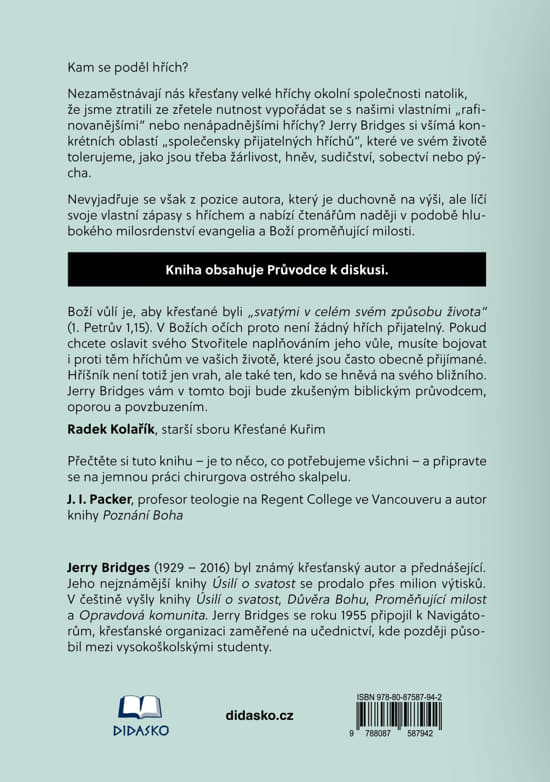 Kam se poděl hřích? Nezaměstnávají nás křesťany velké hříchy okolní společnosti natolik, že jsme ztratili ze zřetele nutnost vypořádat se s našimi vlastními „rafinovanějšími“ nebo nenápadnějšími hříchy? Jerry Bridges si všímá konkrétních oblastí „společensky přijatelných hříchů“, které ve svém životě tolerujeme, jako jsou třeba žárlivost, hněv, sudičství, sobectví nebo pýcha. Nevyjadřuje se však z pozice autora, který je duchovně na výši, ale líčí svoje vlastní zápasy s hříchem a nabízí čtenářům naději v podobě hlubokého milosrdenství evangelia a Boží proměňující milosti. Kniha obsahuje Průvodce k diskusi.
