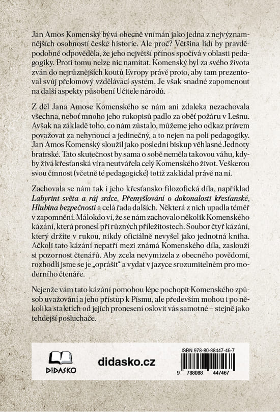 Jan Amos Komenský nebyl pouze učitelem a autorem v oblasti padogiky. Byl také posledním biskupem Jednoty bratrské a veškerá jeho akademická činnost stála právě na jeho hluboké víře a oddanosti Písmu. Dílo Vybraná kázání sice nepatří mezi to nejznámnější z pera Učitele národů, tato sbírka čtyř kázání z různých příležitostí však dává nahlédnout do způsobu, jakým Komenský přemýšlel a jak uvažoval o Božím slově. Přeloženo do srozumitelné moderní češtiny 21. století.