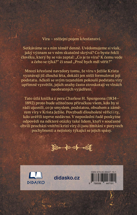 Tato útlá knížka z pera Charlese H. Spurgeona (1834–1892) proto bude užitečnou příručkou všem, kdo by si rádi ujasnili, co je smyslem, podstatou, obsahem a záměrem víry v Krista Ježíše. Povzbudí dlouholeté věřící i ty, kdo uvěřili teprve nedávno. V neposlední řadě poskytne odpovědi na některé otázky také lidem, kteří v současné chvíli prochází vnitřní krizí víry či jsou zmítáni v poryvech pochybností a nejistoty týkající se jejich spásy.