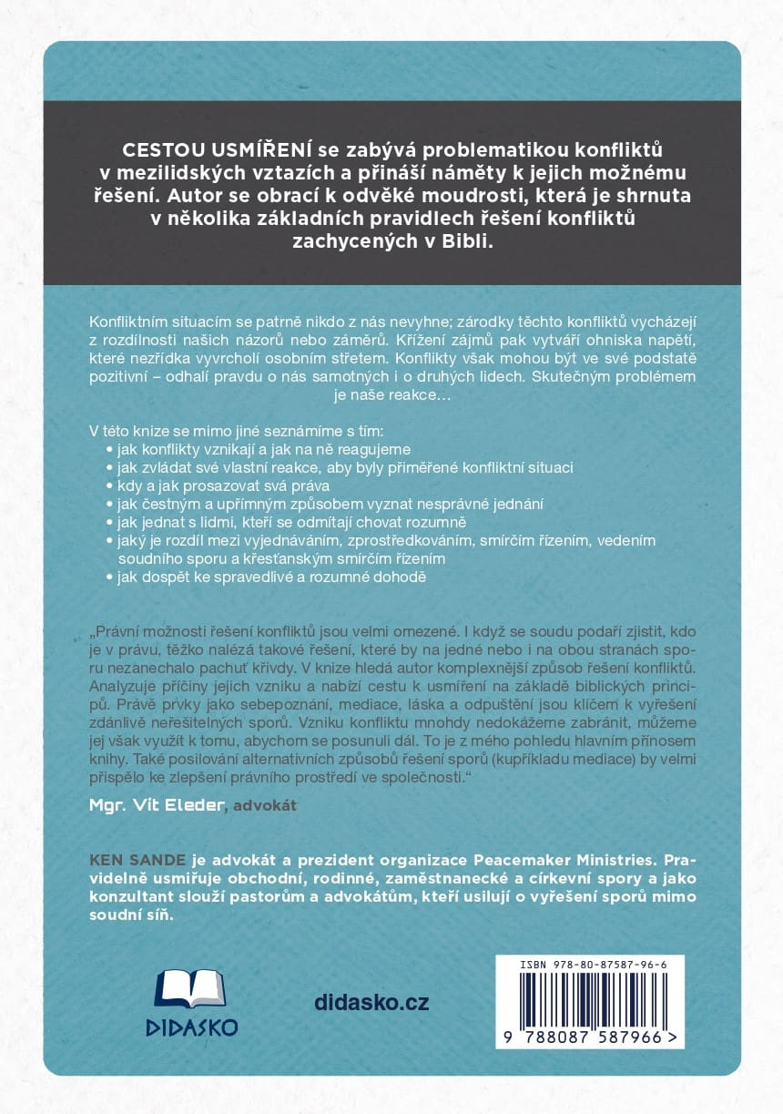 Cestou usmíření se zabývá problematikou konfliktů v mezilidských vztazích a přináší náměty k jejich možnému řešení. Autor se obrací k odvěké moudrosti, která je shrnuta v několika základních pravidlech řešení konfliktů zachycených v Bibli.