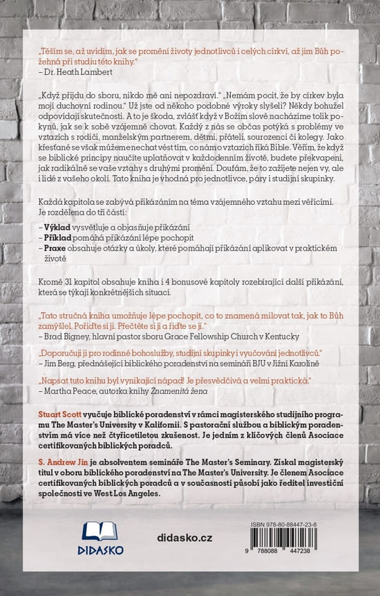 „Když přijdu do sboru, nikdo mě ani nepozdraví.“ „Nemám pocit, že by církev byla mojí duchovní rodinou.“ Už jste od někoho podobné výroky slyšeli? Někdy bohužel odpovídají skutečnosti. A to je škoda, zvlášť když v Božím slově nacházíme tolik pokynů, jak se k sobě vzájemně chovat. Každý z nás se občas potýká s problémy ve vztazích s rodiči, manželským partnerem, dětmi, přáteli, sourozenci či kolegy. Jako křesťané se však můžeme nechat vést tím, co nám o vztazích říká Bible. Věřím, že když se biblické principy naučíte uplatňovat v každodenním životě, budete překvapeni, jak radikálně se vaše vztahy s druhými promění. Doufám, že to zažijete nejen vy, ale i lidé z vašeho okolí. Tato kniha je vhodná pro jednotlivce, páry i studijní skupinky.