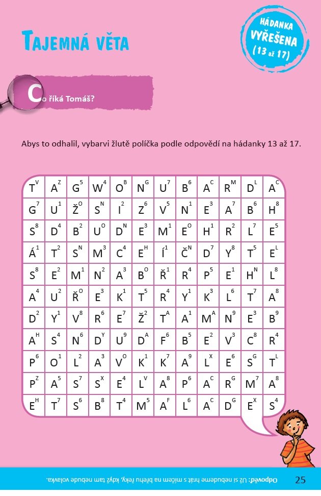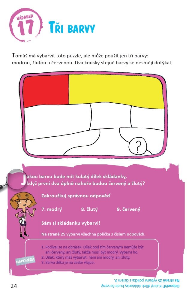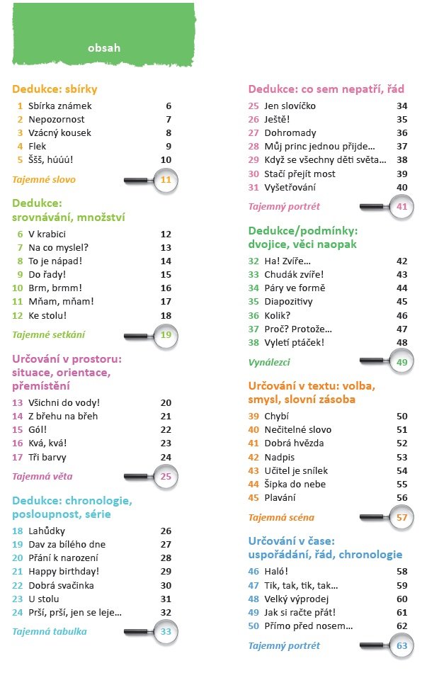 Sešit obsahuje úkoly pro trénování logického a matematického myšlení a rozvíjení úsudku dětí pomocí dedukce, kombinace více prvků, orientace v čase a prostoru. Nabízí 50 hádanek, v nichž děti trénují čtení s porozuměním, analýzu informací, pozorování obrázků a schémat, chápání vztahů mezi odlišnými prvky. Každý úkol obsahuje logické nápovědy, které neprozrazují řešení, ale dál vedou myšlení dítěte k správnému závěru. Ověřování výsledku se odehrává na samostatné straně, kde se postupně skládá další úkol.