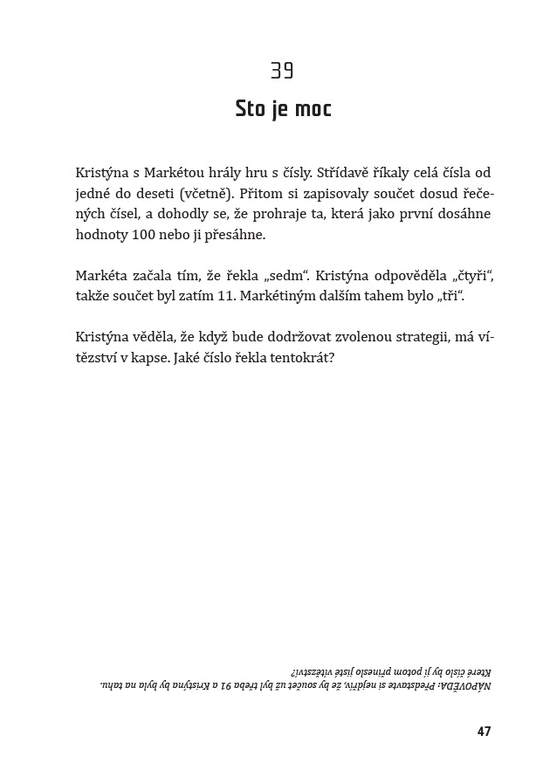 Jestli nechcete, aby se vám prášilo na mozkové závity a aby vaše neurony usychaly nudou, pořiďte si tuto knihu. Stovka vtipných hádanek, které se nikdy neochodí a jež navíc napnou vaše synapse až k prasknutí. S touto knihou se nikdy nebudete nudit!