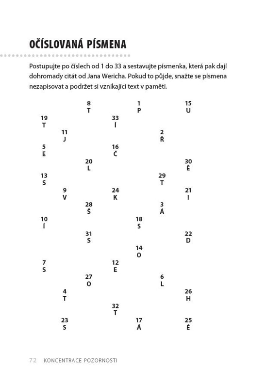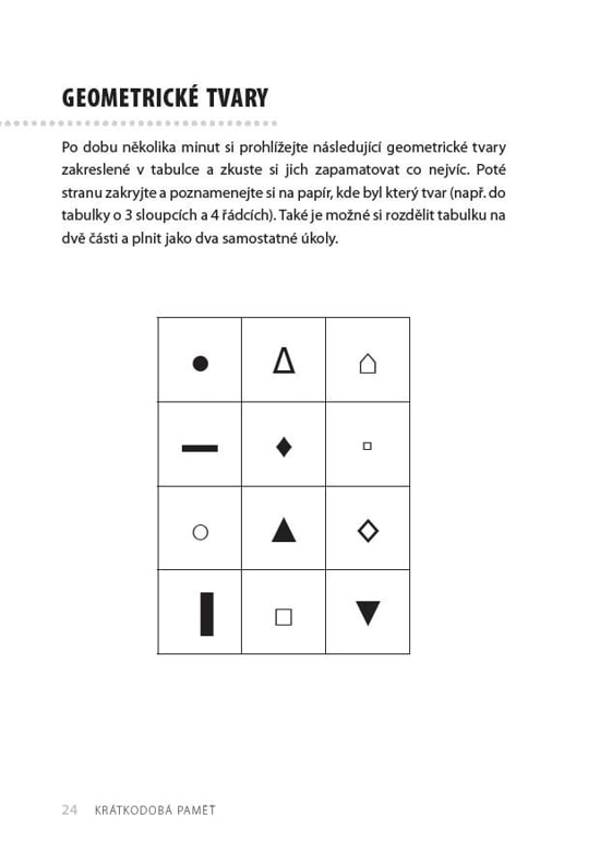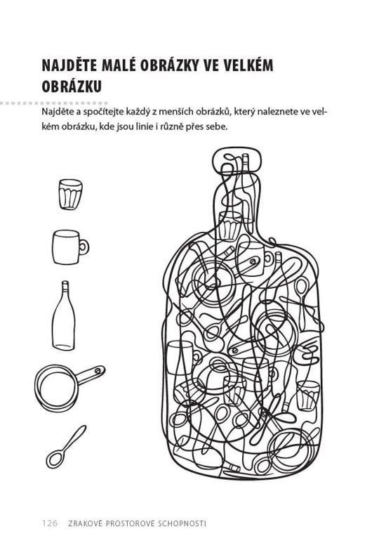 Kniha obsahuje celou řadu úkolů, cvičení a kvízů zaměřených na krátkodobou i dlouhodobou paměť, pozornost, zapamatování detailů a práci s nimi, a to vše na úrovni zrakového vnímání. Jednotlivé úkoly jsou řazeny do určitých oblastí, je tedy možné se cíleně zaměřit na rozvoj jedné oblasti, anebo pracovat pouze s těmi, které čtenáře nejvíce baví. Toto ale není podmínkou a je možné si knihu užít i „na přeskáčku“.