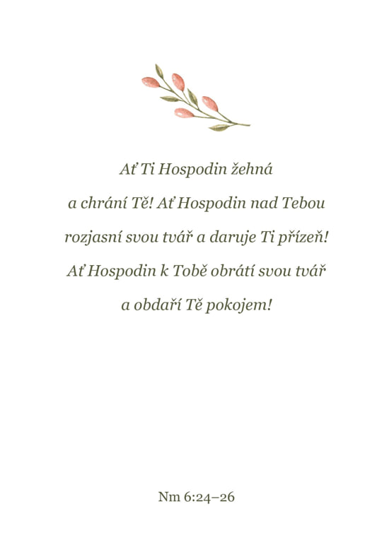 Biblický verš uvnitř: „Ať Ti Hospodin žehná a chrání Tě! Ať Hospodin nad Tebou rozjasní svou tvář a daruje Ti přízeň! Ať Hospodin k Tobě obrátí svou tvář a obdaří Tě pokojem!“ Numeri 6:24–26