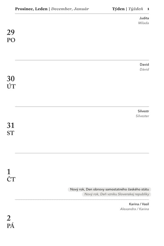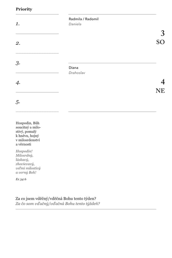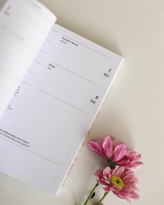• při každém týdnu prostor na poznámky, to-do seznam, vděčnost